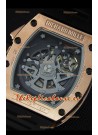 Dial tipo Skeleton con Ventana Indicadora de Fecha entre las 4 y 5 Horas. Botones empujadores y Corona chapados en Oro Rosado