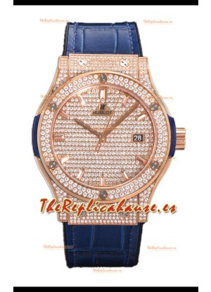 Hublot Classic Fusion Automático Dial Oro Rosado pavimentado en Diamantes Correa Azul 42MM Reloj Superclone Réplica