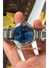 Dial Azul con Numerales de Hora Romanos, Indicador de Fecha a las 3 en Punto, y Marca Distintiva Cartier en el Contador de las 7 en Punto. Zafiros Azules en la punta del Vástago.