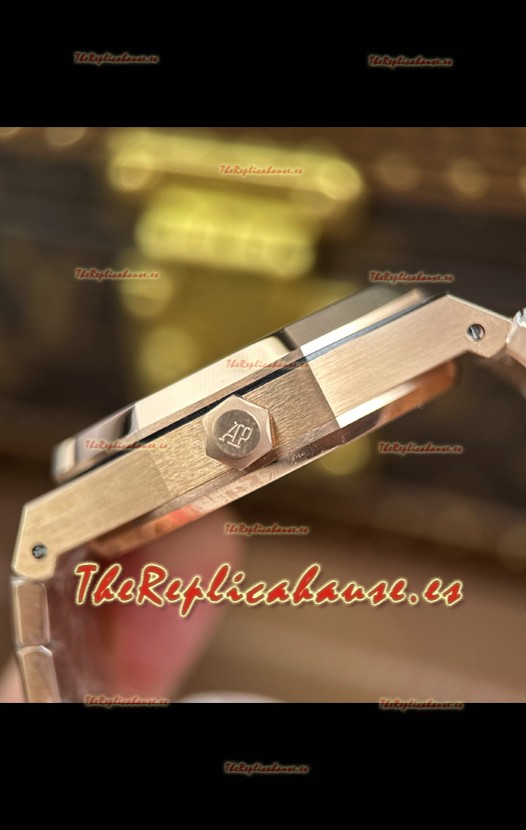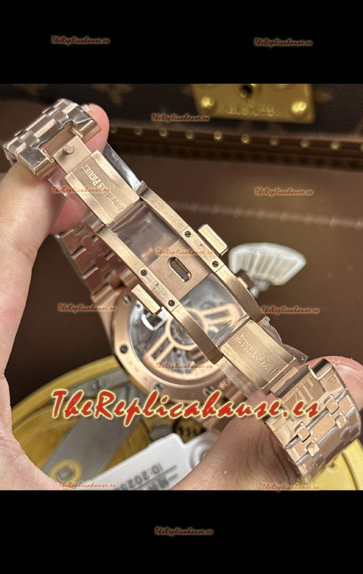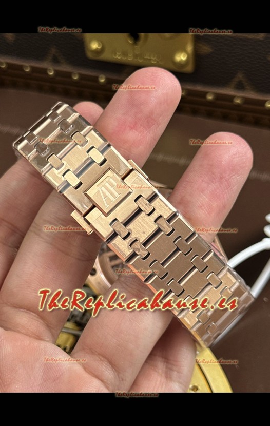 Caja Acero Inoxidable 904L chapada en Oro Rosado 18K Strap completada con Marcas y Grabados Audemars Piguet y cierres con la firma AP.