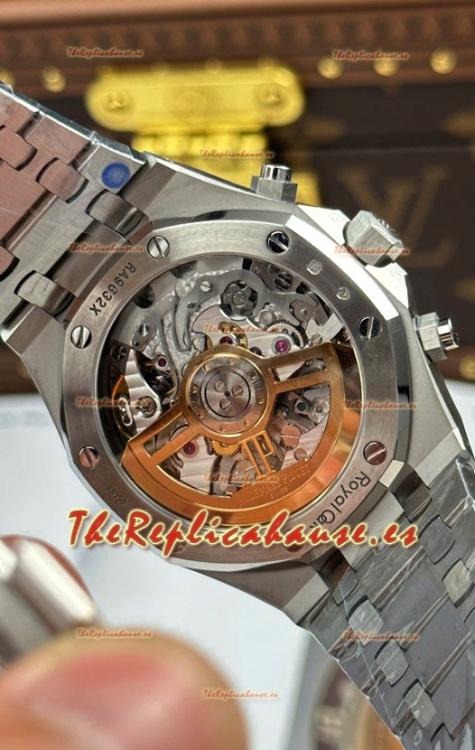 Disposición de la Maquinaria Idéntica al Movimiento Audemars Piguet Calibre 4401 utilizado en los Auténticos relojes Audemars Piguet Offshore.. Construido sobre la Genuina Arquitectura del Movimiento Suizo 7753 con Función de Cronómetro Funcional como como el auténtico con manecillas Segunderas corriendo en el Dial de las 12 en Punto