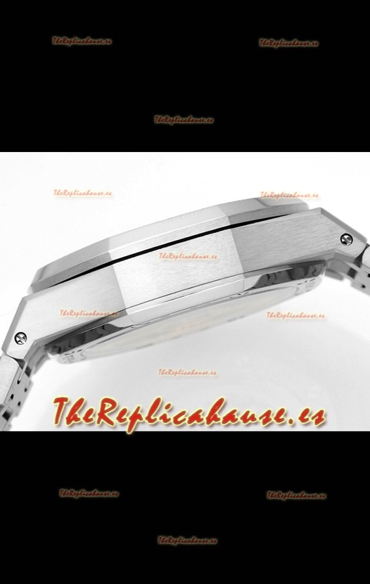 Caja de Acero 904L chapada en Oro Blanco Esmerilado completada con Marcas y Grabados AP.
