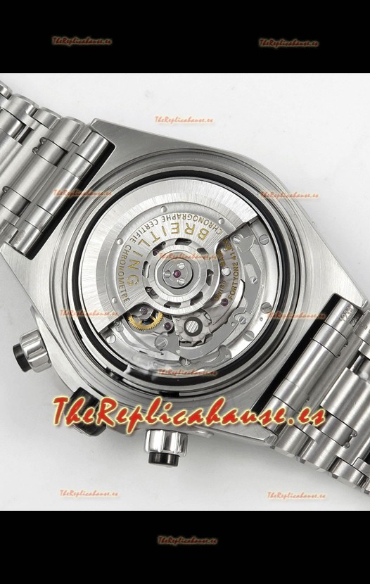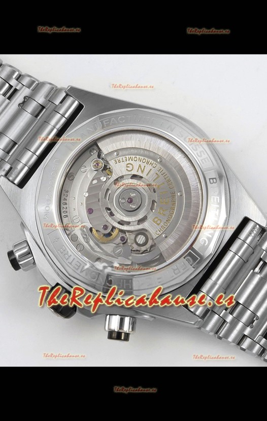 Cristal de Zafiro a prueba de Rasguños con Doble Revestimiento AR en ambos lados, Cubierta trasera de Cristal de Zafiro Transparente completada con Marcas y Grabados Breitling