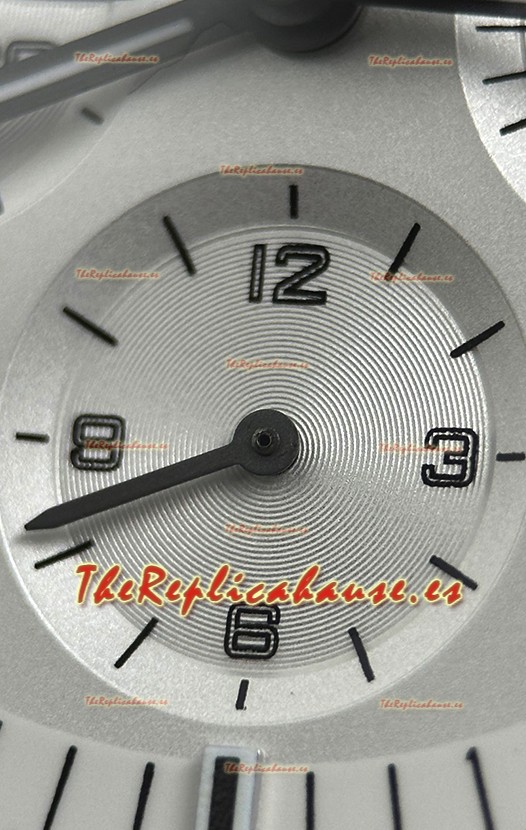 Dial Blanco con 3 Sub Diales Funcionales. Sub Dial a las 6 en Punto que se mueve junto con la Manecilla Horaria que es ligeramente diferencia comparada con los originales