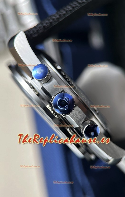 Caja Acero Inoxidable Solido Pulido 904L con Bisel Taquimétrico Azul.