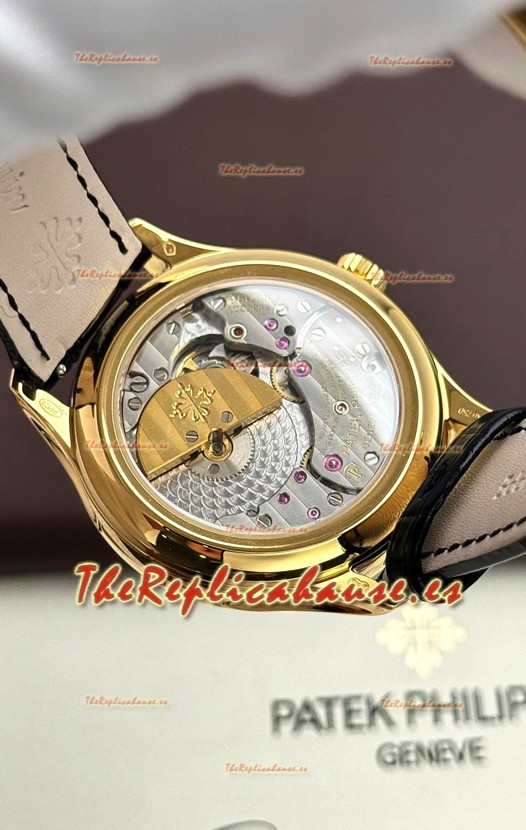 Movimiento Suizo Genuino 9015 ensamblado para parecerse al movimiento auténtico Patek Philippe estilo calibre PP 324. Rotor, puente y Grabados actualizados en el movimiento con rotor bañado en Oro Rosado con el sello de Patek Philippe