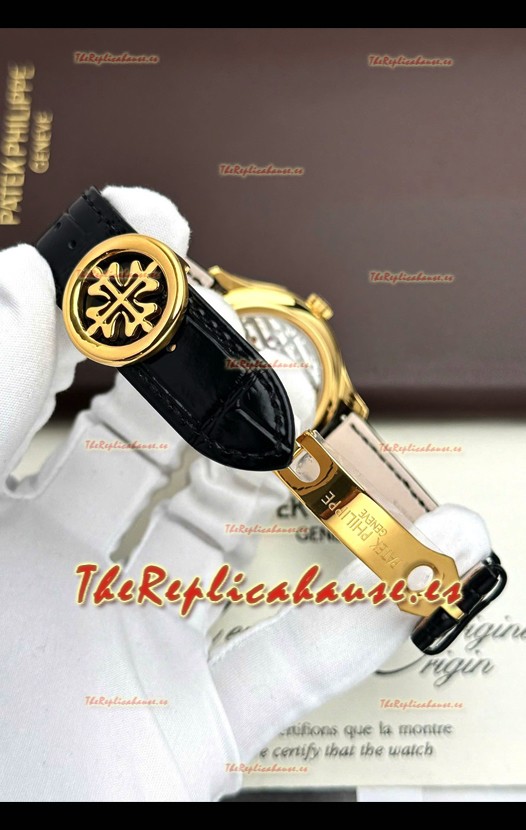 Genuina Correa de Piel con Cierre Plegable chapado en Oro Amarillo completada con Marcas y grabados Patek Philippe.