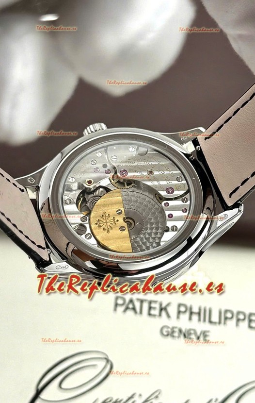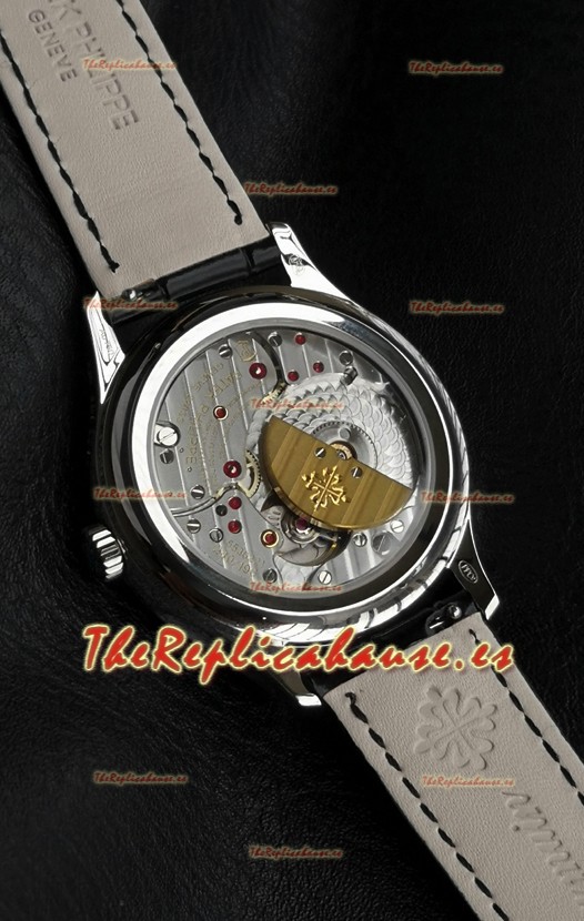 Movimiento Suizo Genuino 9015 ensamblado para parecerse al movimiento auténtico Patek Philippe estilo calibre PP 324. Rotor, puente y Grabados actualizados en el movimiento con rotor bañado en Oro Rosado con el sello de Patek Philippe