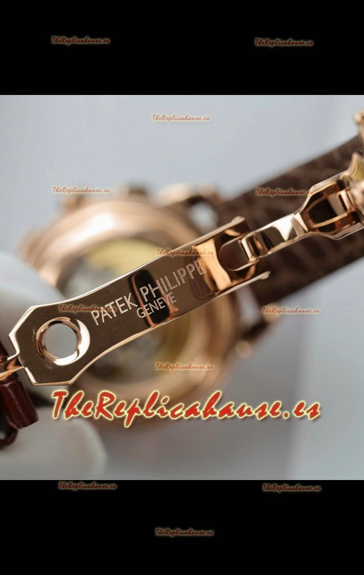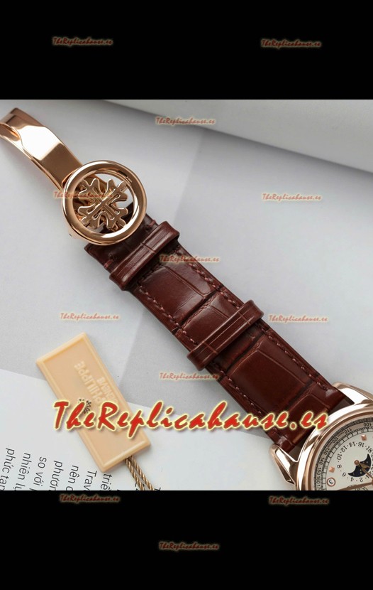Genuina Correa de Piel con Cierre Plegable chapado en Oro Rosado completada con Marcas y grabados Patek Philippe.