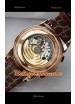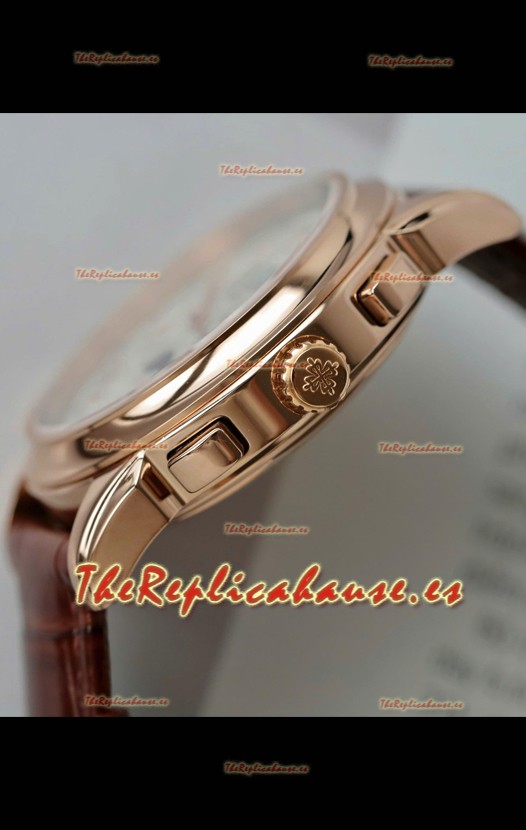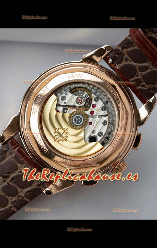 Movimiento Suizo Genuino 9015 ensamblado para parecerse al movimiento auténtico Patek Philippe estilo calibre PP 324. Rotor, puente y Grabados actualizados en el movimiento con rotor bañado en Oro Rosado con el sello de Patek Philippe