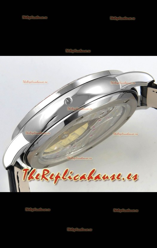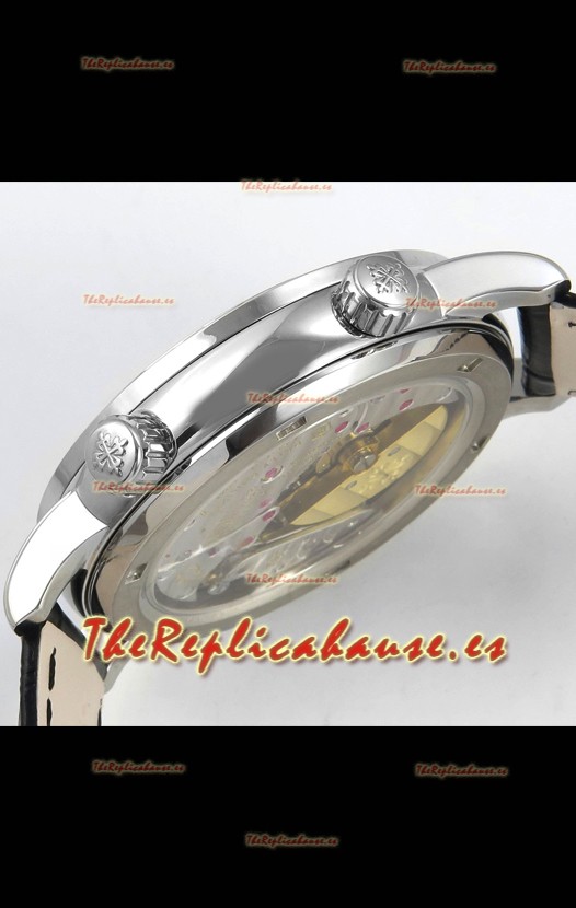 Fecha es Ajustable en la Corona de las 2 en Punto, Fase Lunar se ajusta a través de la Corona a las 4 en Punto (Fase Lunar es un Indicador Dia/Noche y no la Fase Lunar encontrada en los Relojes Patek Philippe Original 6120P)