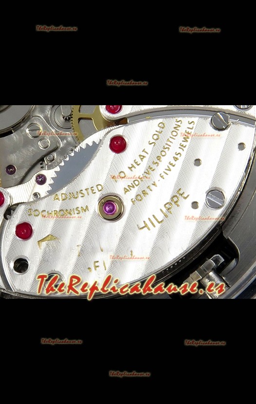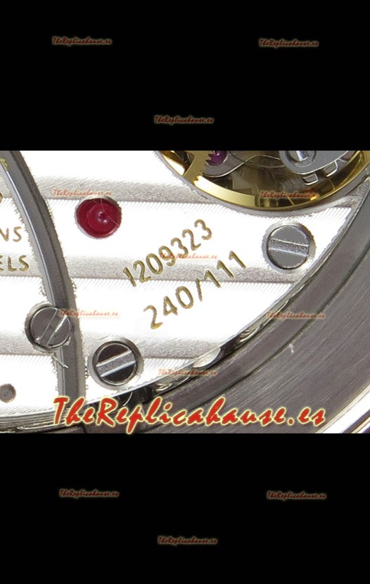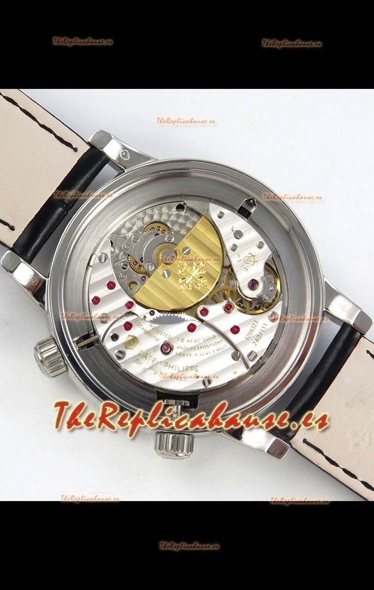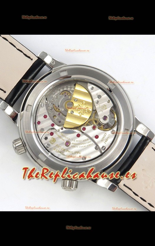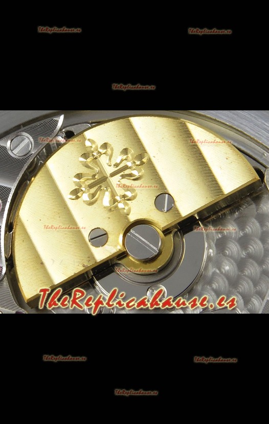 Genuino Movimiento Suizo 9015, Ensamblado para Parecerse al Movimiento Auténtico Patek Philippe PP 240 Calibre. Rotor, Puente y Grabados en el Movimiento actualizados, con Rotror chapado en Oro Rosado con el sello Patek Philippe.