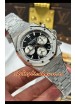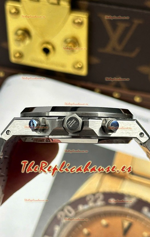 Disposición de la Maquinaria Idéntica al Movimiento Audemars Piguet Calibre 4401 utilizado en los Auténticos relojes Audemars Piguet Offshore.. Construido sobre la Genuina Arquitectura del Movimiento Suizo 7753 con Función de Cronómetro Funcional como como el auténtico con manecillas Segunderas corriendo en el Dial de las 12 en Punto