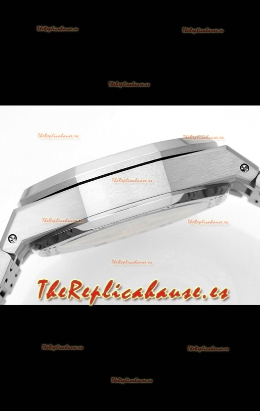 Disposición de la Maquinaria Idéntica al Movimiento Audemars Piguet Calibre 4401 utilizado en los Auténticos relojes Audemars Piguet Offshore.. Construido sobre la Genuina Arquitectura del Movimiento Suizo 7753 con Función de Cronómetro Funcional como como el auténtico con manecillas Segunderas corriendo en el Dial de las 12 en Punto
