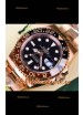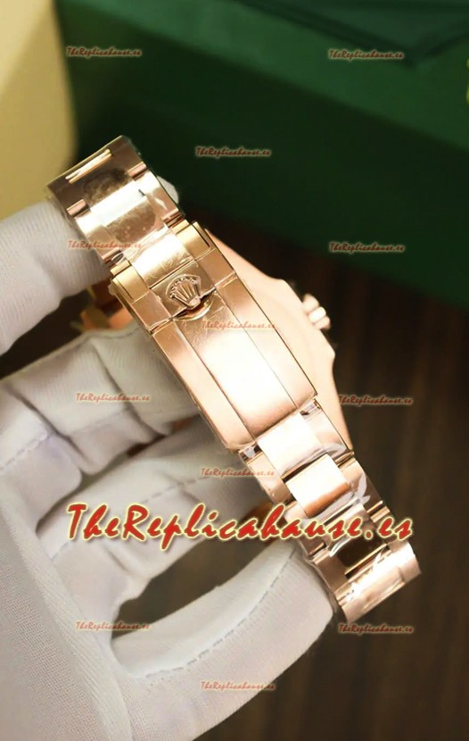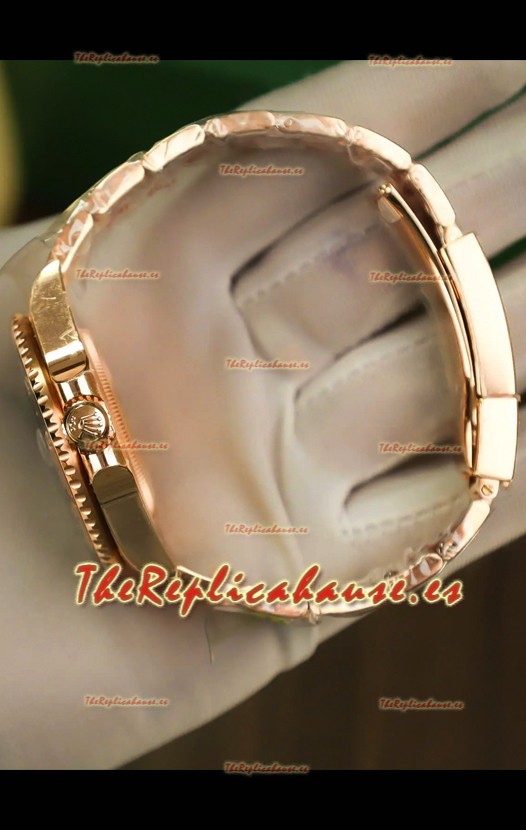 Correa de Acero Inoxidable 916L chapada en Oro Rosado 18K unida con Tornillos, el mejor brazalete fabricado hasta la fecha para la Serie GMT con Cierres estilo Flip Lock completos con Marcas y Grabados Rolex. Barra de Resorte Lug 2MML con cabezas redondeadas exactamente como en las Correas de los Relojes GMT Originales.