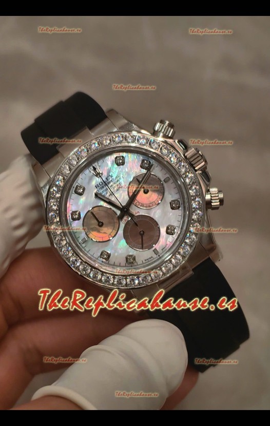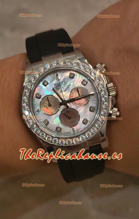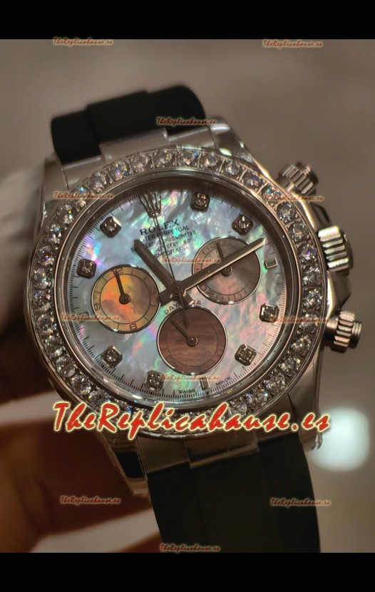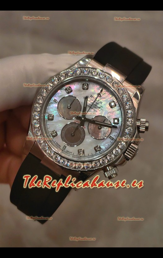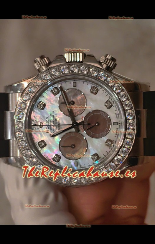 Dial Perla con Marcadores de Hora de Diamantes con 3 Sub Diales Funcionales, como el Auténtico.